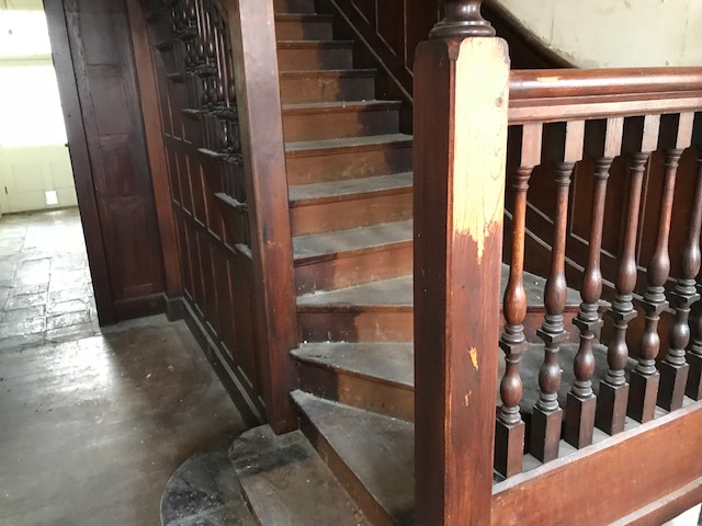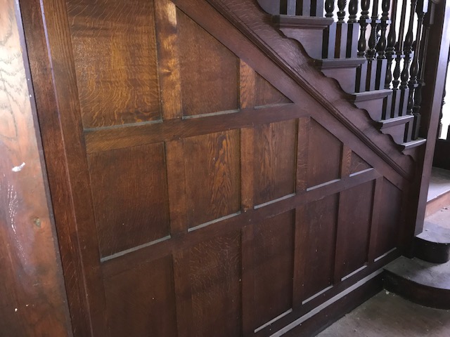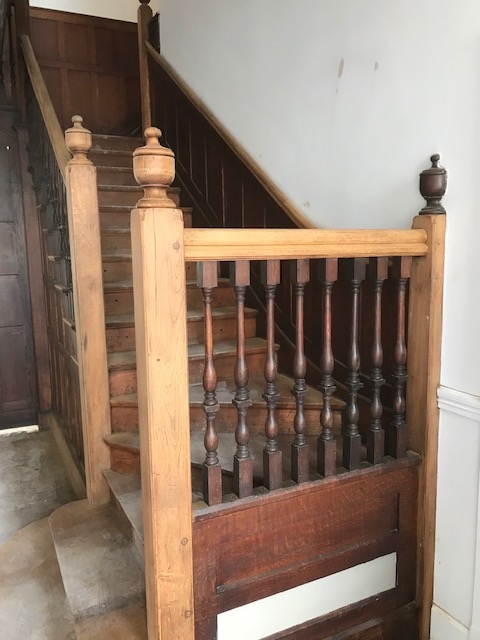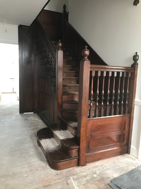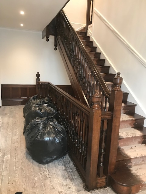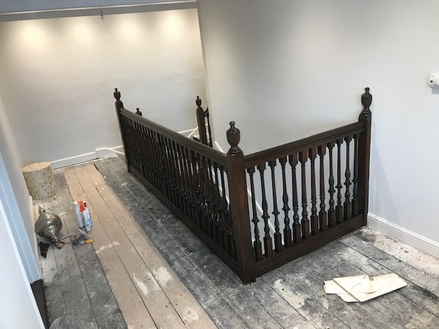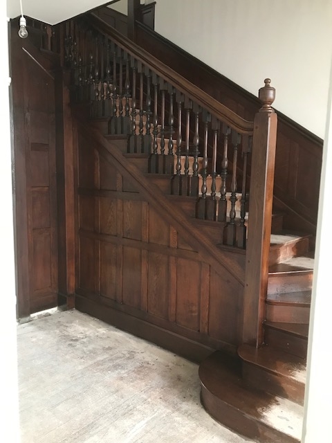 This oak staircase and panelling was over three floors we stripped the hand rails ,newel posts and steps and stained and re polished to match the existing woodwork